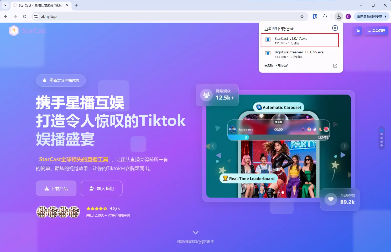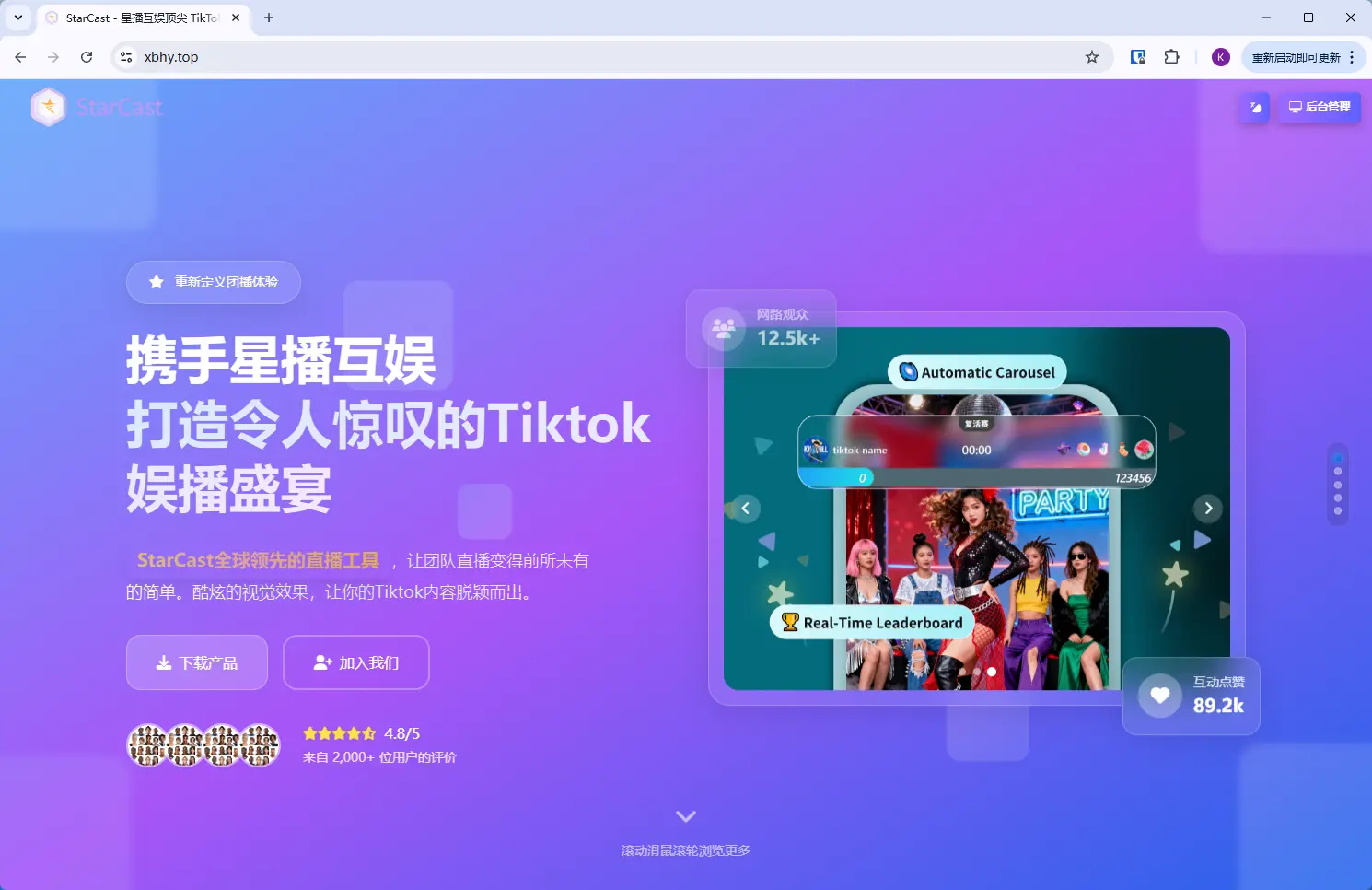 歡迎使用星播互娛StarCast平臺!請訪問我們的官網 https://www.xbhy.top/ ,點擊頁面上的 “下載產品” 按鈕,即可安裝最新版平臺客戶端,開啟您的卓越直播體驗。