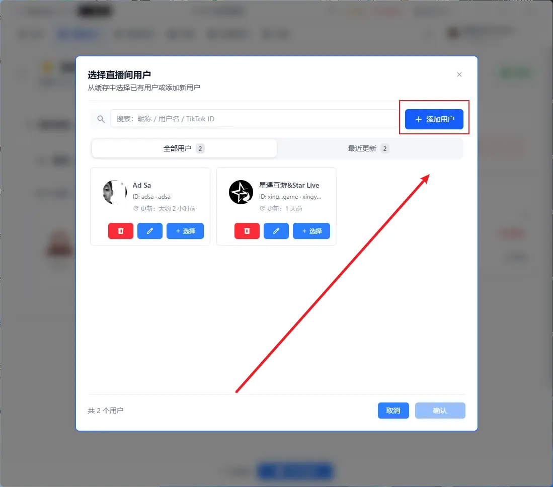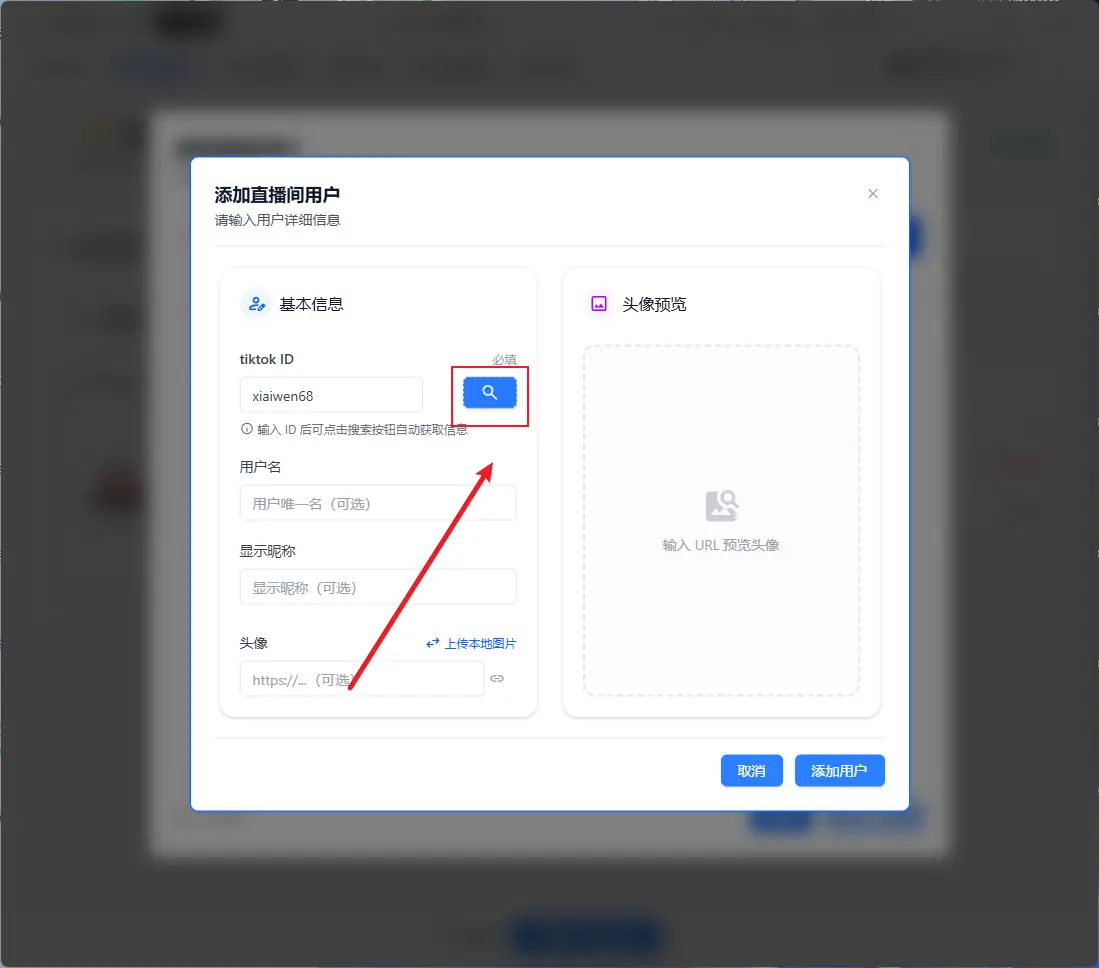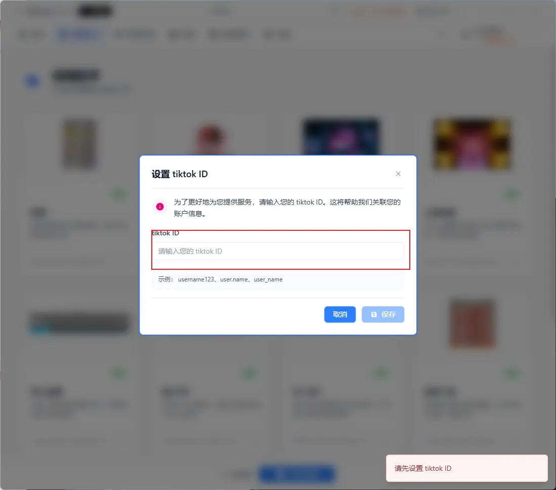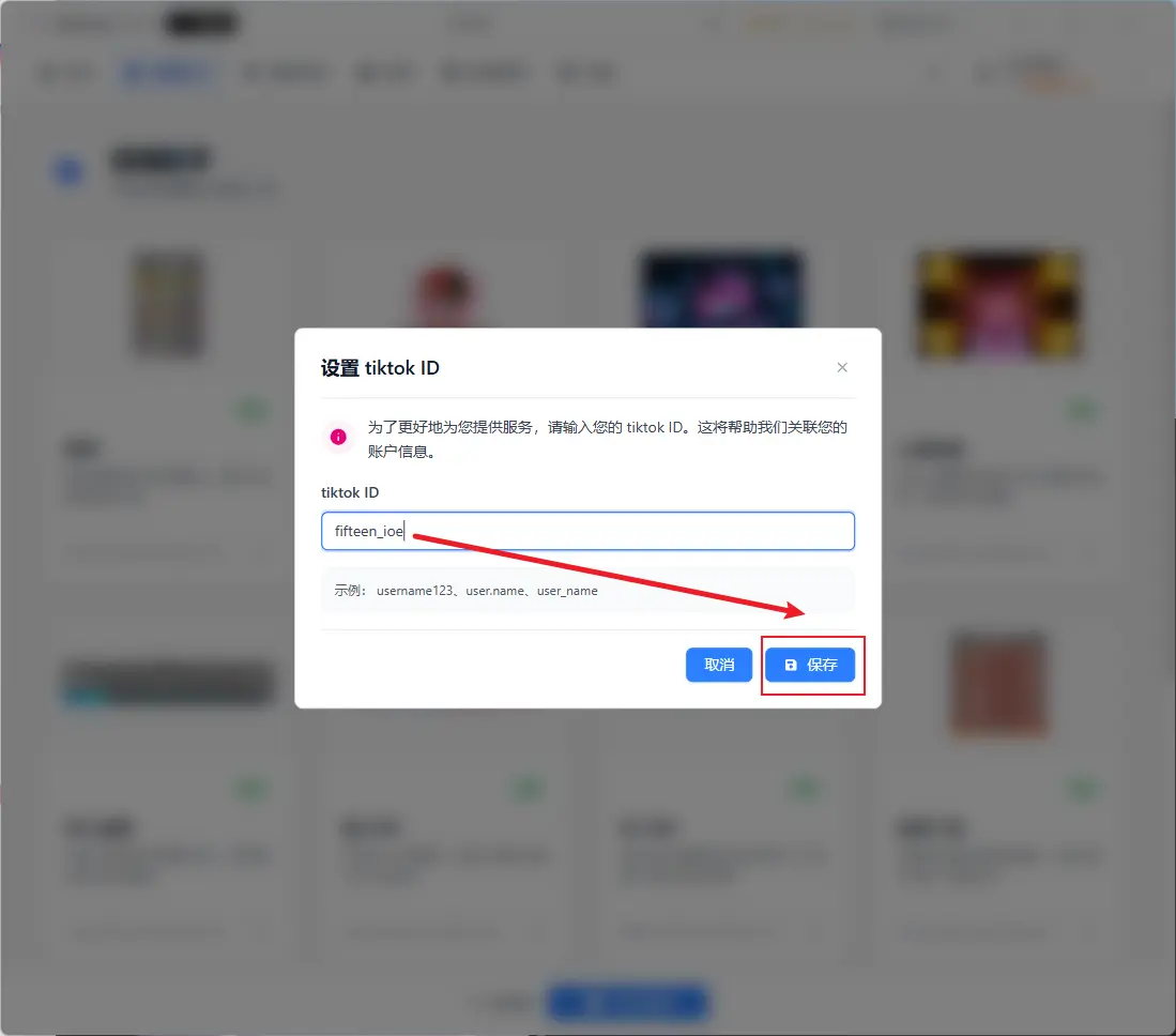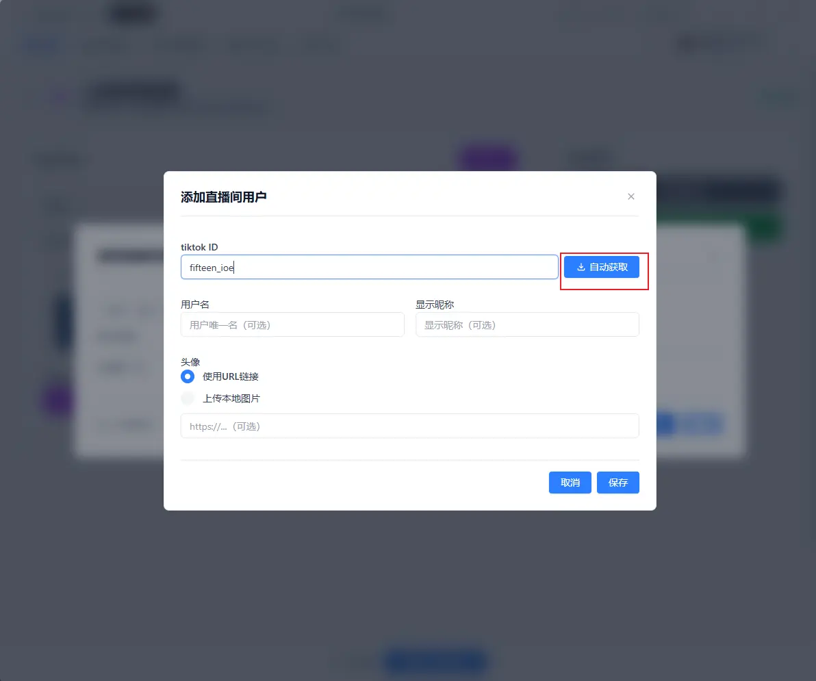 輸入TikTokID點擊自動獲取,保存之後自動選擇剛剛添加的用戶