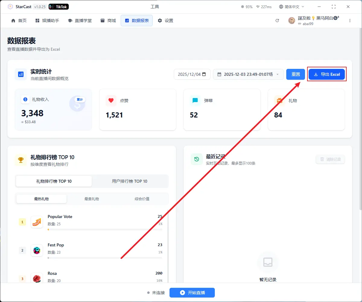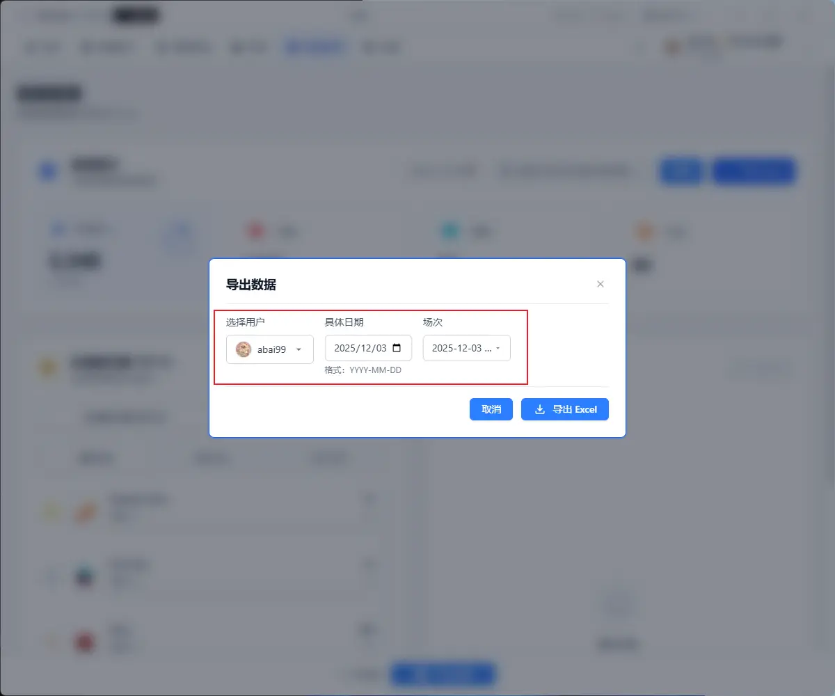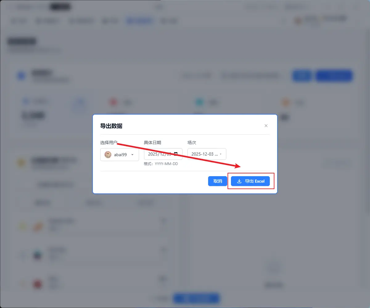 選擇要匯出的用戶以及日期和具體場次,點擊匯出
