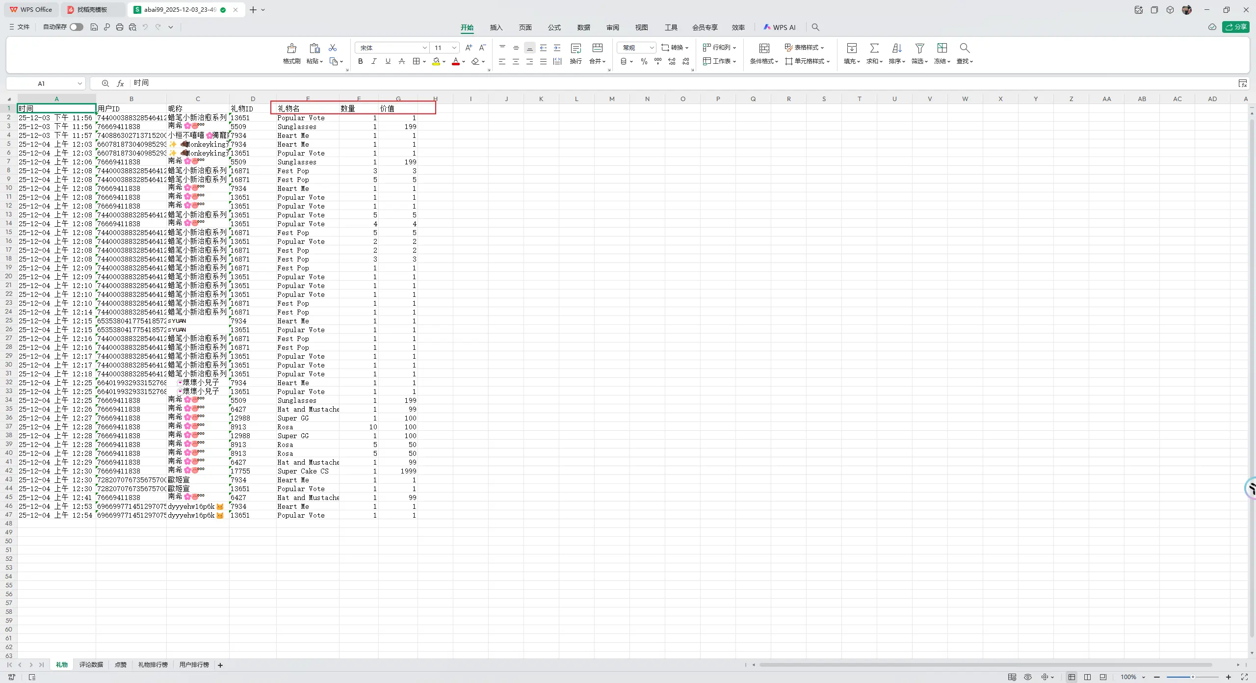 在保存的路徑找到匯出的Excel檔案,雙擊打開,可以看到禮物名和價值